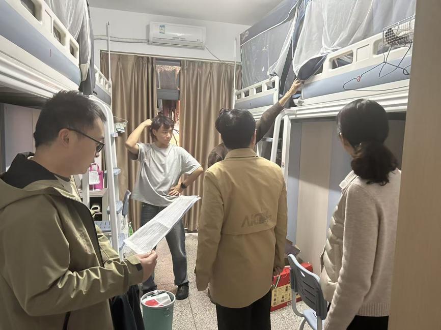 检查组秉持“全覆盖、零死角、重实效”的原则,逐间开展核查,核心围绕守护学生安全健康展开。在学生宿舍,检查组重点排查各类安全隐患,同时反复叮嘱学生,春季气温回升需注意宿舍通风换气,保持内务整洁,远离违禁电器,规范用水用电,增强自我防护意识,照顾好自身生活起居,养成良好卫生习惯。在研究生工作室,检查组排查安全隐患,检查卫生情况,同时耐心提醒学生,在科研学习之余要兼顾身心健康,合理安排作息,学院将全力为同学们营造良好的科研学习和居住生活环境。